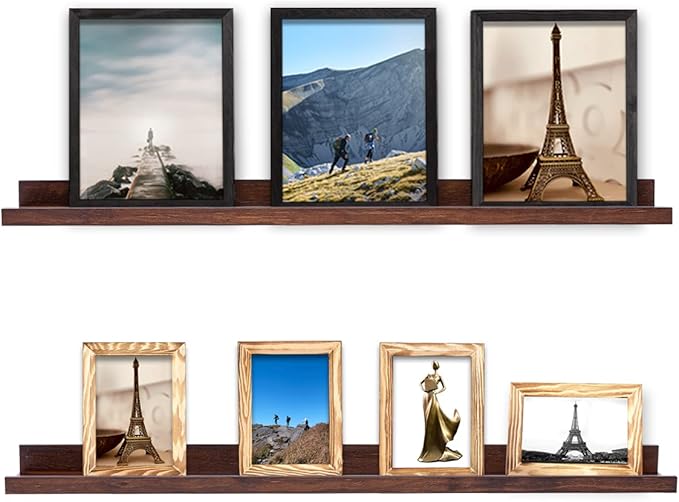 - Deep Walnut Wall Ledge Book Shelf:The size of photo ledges is 48in x 4.5in x 2in,Wall shelves are made of natural wood which is healthy and tasteless. So they are sturdy enough to hold your favorite collections, family photos (as picture ledge shelf), kids’ books, decorative items, cosmetics or green plants.