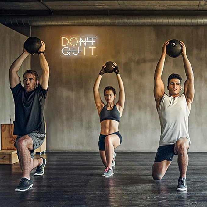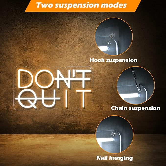 - Style & Material: The sign of Don't Quit (it also means to DO IT, don't give up)neon light is an exquisite artistic neon light decor sign. The LED neon light's combination of yellow and white is novel. The Neon Signs are made of Acrylic LED, Silicon Strips, and ABS Material, with No risk of glass breakage or leakage of hazardous materials
