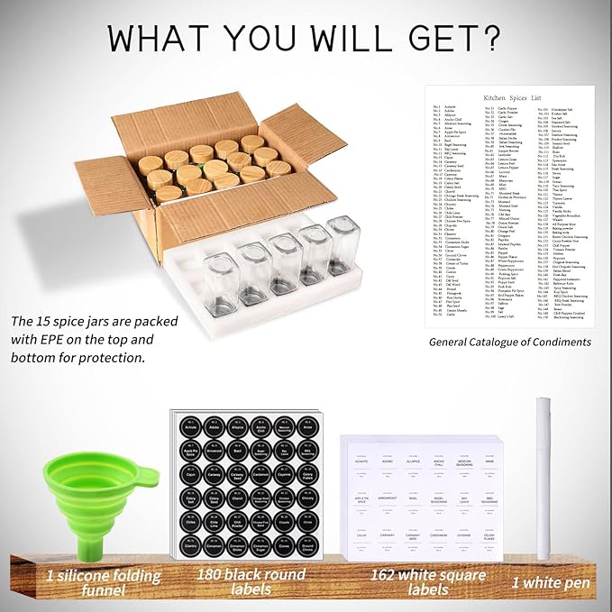 • Complete 4 oz Spice Jars Set: This set of spice jars contains: 36 4oz glass spice jars with bamboo lids, 1 complete list of spices, 180 black round labels, 162 white square labels, 1 white pen , 1 silicone folding funnel for refilling