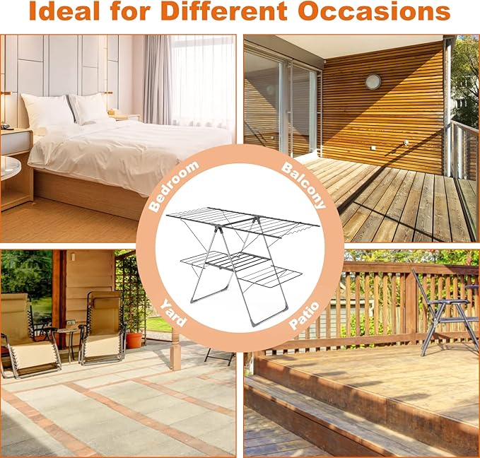 - 👕【Adjustable Height for Versatile Drying】 Our Drying Rack's (up to 62 inch) accommodate long garments like coats, dresses, and curtains without dragging on the ground. Ideal for indoor or outdoor use!