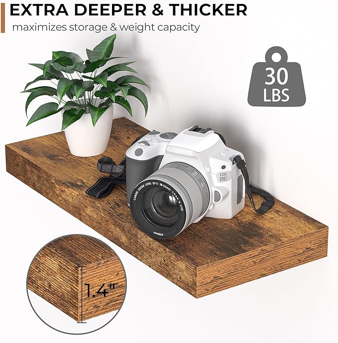 - Extra Deeper & Thicker - Each board measures 16"W x 6.7"D x 1.4"H. Extra deeper and thicker design in order to bring maximizes storage space and weight capacity, even hold up to 30 lb each. This floating shelf taking up zero square feet, reduces clutter and highlights dÃĐcor in compact spaces.