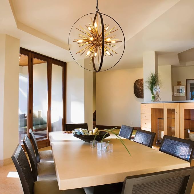 - 【Stylish Design】The body of the Black and Gold Sputnik Chandelier is wrapped in a spherical shape, like a preserved firework. Every time the lights come on, it's like a small fireworks show sparking up your room. Ideal for living room, kitchen island, dining room, hallway, stairway, entryway, café & restaurant.