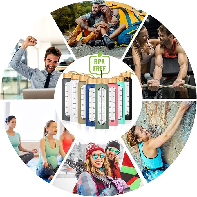 • Stay Motivated - Easily track your water intake throughout the day with tracking directly on your clear glass water bottles with times to drink. Reach your health goals whenever your day takes you with these aesthetic water bottles