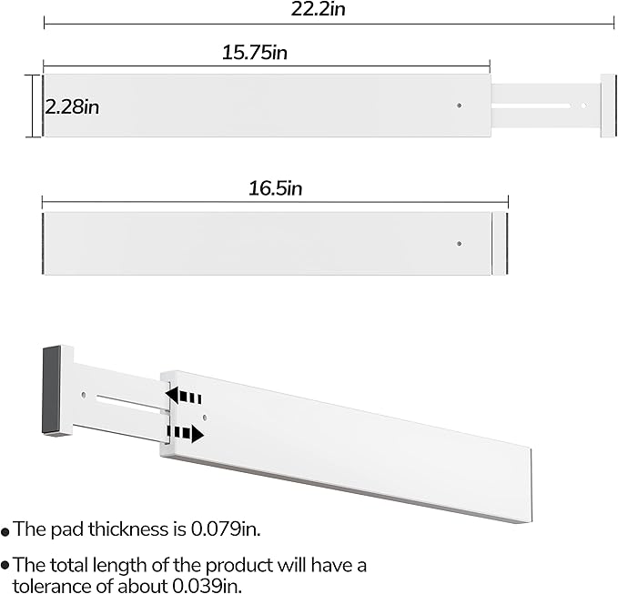 • EXPANDABLE: The size is 16.77 inch (un-expanded) to 22.05 inch (expanded); The pad thickness is 0.079 in, and the total length of the product will have a tolerance of about 0.039 in; Compressed packaging in transit may prevent the spring from being fully stretched to a sufficient length; At this time, please manually pull out the dividers to the top to ensure sufficient length
