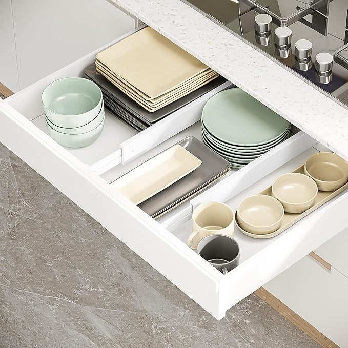 • MULTIPUL USED FOR ORGANIZATION: You can use BAMEOS drawer dividers in any drawers of your bedroom, office, kitchen, living room and garage; It can keep your drawer neat and organized all the time
