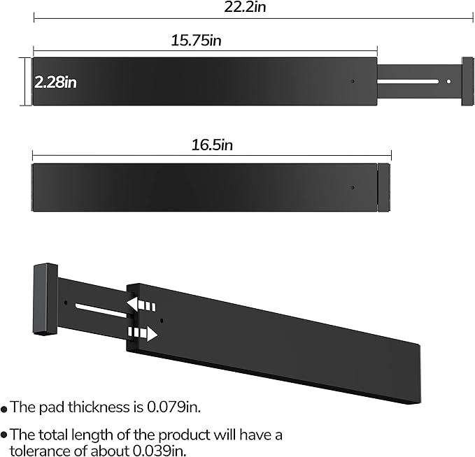 • EXPANDABLE: The size is 16.77 inch (un-expanded) to 22.05 inch (expanded); The pad thickness is 0.079 in, and the total length of the product will have a tolerance of about 0.039 in; Compressed packaging in transit may prevent the spring from being fully stretched to a sufficient length; At this time, please manually pull out the dividers to the top to ensure sufficient length