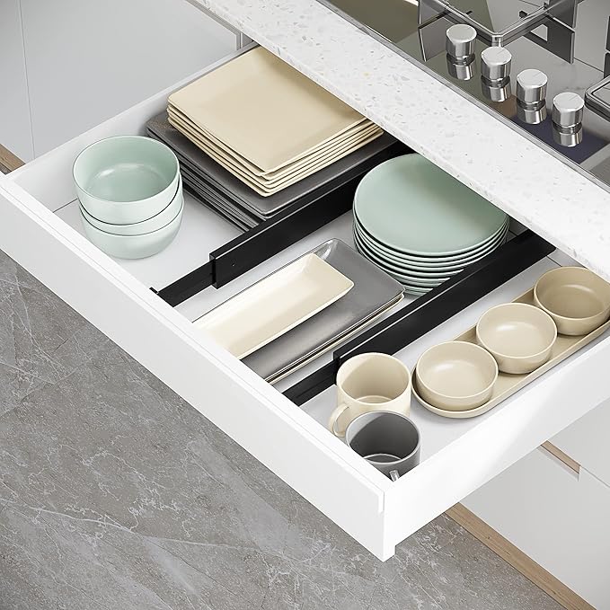 • MULTIPUL USED FOR ORGANIZATION: You can use BAMEOS drawer dividers in any drawers of your bedroom, office, kitchen, living room and garage; It can keep your drawer neat and organized all the time