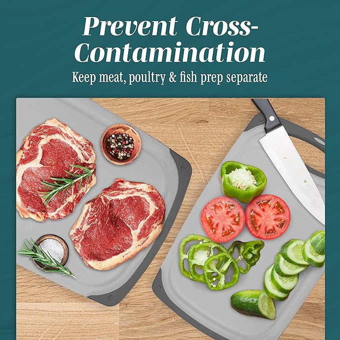 • VERSATILE COOKING - Our plastic cutting board set is great for every kind of chopping. Use it for fruit, as a meat cutting board, a fish cleaning station, or put it over the sink for extra counter space.