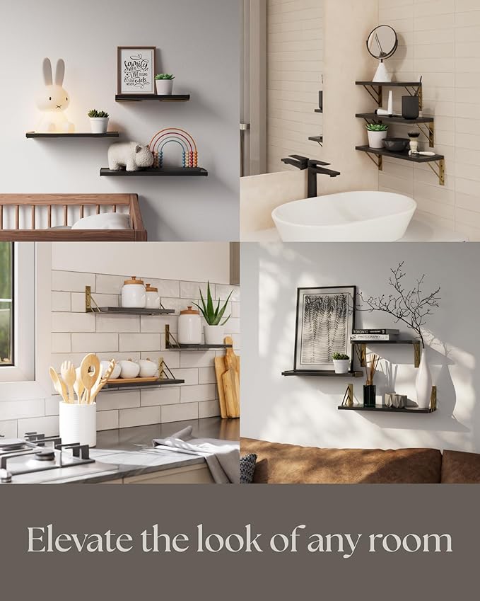BAYKA Wall Shelves for Bedroom Decor, Floating Wall Shelves for Living Room Kitchen Storage, Wall Mounted Rustic Wood Floating Shelves for Kids Books, Corner Shelves for Bathroom, Office(Set of 3)