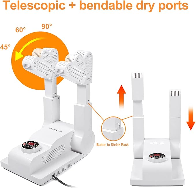 - 【Creative Telescopic Bendable Design】Say goodbye to damp, uncomfortable footwear with the FORLIM shoe dryer! Experience the difference with our Innovative telescopic and bendable dry ports that can reach deep inside the toe box of high boots. While the 180° foldable dry rack can accommodate footwear and gloves of all sizes and shapes. Keep your shoes and boots dry and comfortable with this innovative and easy-to-use dryer