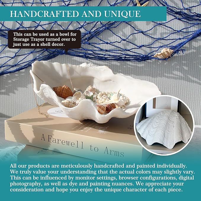- 【Size】This White Seashell decorative bowls made from 100% solid resin, -3.6" tall, 10.23" wide and 8.6" deep approximately. Clamshell decorative bowls Sufficient for home Bathroom Shelf,Room Console,Coffee table,Office Desk,Window Edges and a perfect idea for beach house decor,occasions for beach themed parties or weddings