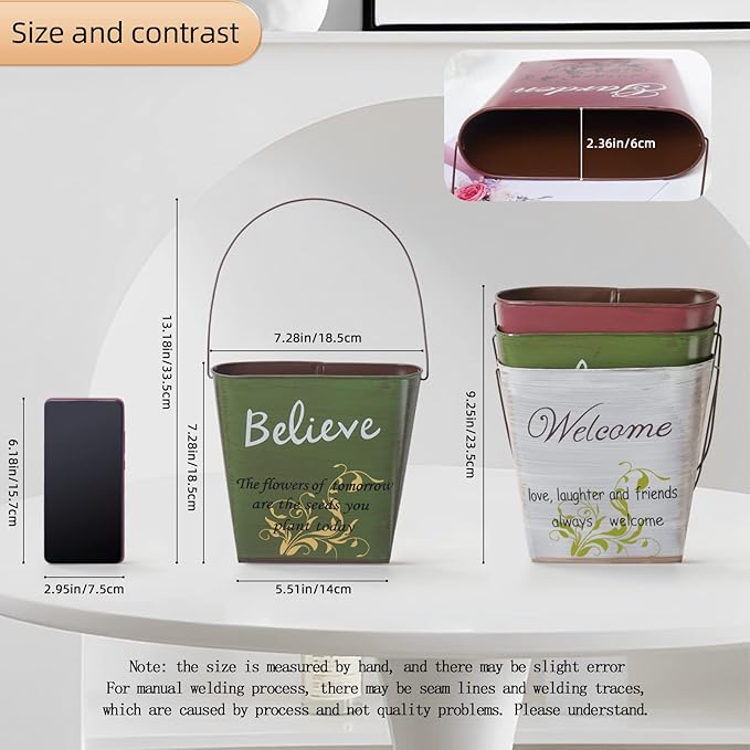 • [Size]Set of 3 metal hanging wall planters, top: 7.2'' x 2.4'', height: 7.4'', handle: 5.6''. Notice: Artificial flowers and plants are not included.