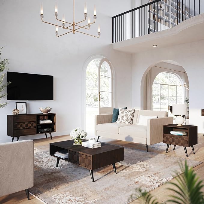 - HANDCRAFTED GEOMETRIC DETAILS: Elevate your space with exquisite handcrafted geometric patterns that seamlessly blend modern and rustic beauty; Come with sleek black metal legs, our solid wood nightstand adds a touch of mid-century style to your home