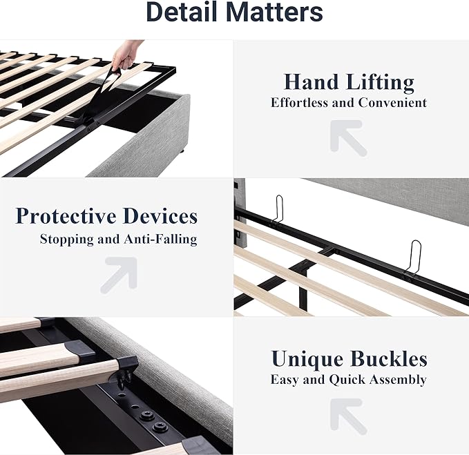 • Space-Saving Storage: With its lifting up storage feature, this bed frame provides ample space to store extra bedding, clothing, shoes, and other items, especially helpful for smaller bedrooms or apartments where storage space is limited