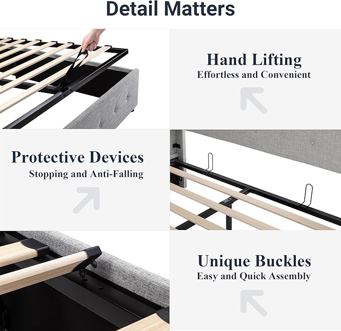 • Space-Saving Storage: With its lifting up storage feature, this bed frame provides ample space to store extra bedding, clothing, shoes, and other items, especially helpful for smaller bedrooms or apartments where storage space is limited