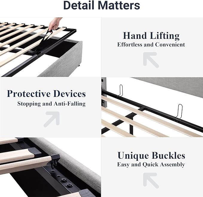 • Space-Saving Storage: With its lifting up storage feature, this bed frame provides ample space to store extra bedding, clothing, shoes, and other items, especially helpful for smaller bedrooms or apartments where storage space is limited