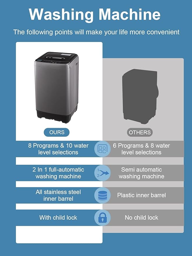 - ๐ใWater Level and Mode Controlใ: 10Programs for choosing: wash-rinse-spin, soak-wash-rinse -spin, wash, wash-risne, rinse-spin, spin. You could adjust the different washing mode through the wash push-button and control the water level via the switch. Different clothes have different washing and water level requirement. You can stop wasting hours keeping an eye on washing machine for its full automatic clean mode.