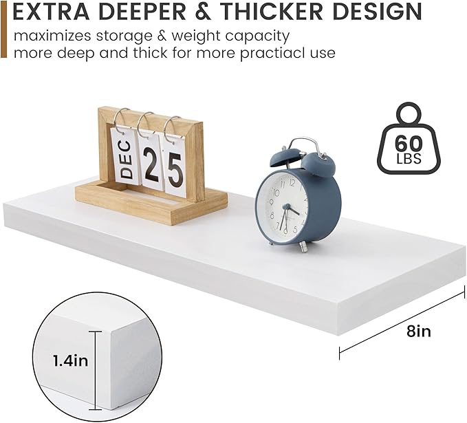 - Extra Deeper & Thicker for Storage - Each board measures 24"W x 8"D x 1.4"H. Extra deeper and thicker design in order to bring maximizes storage space and weight capacity, even hold up to 60 lb. This floating shelf taking up zero square feet, reduces clutter and highlights dÃĐcor in compact spaces. It can help make full use of the empty wall, making it much more space-saving and making your room look larger and tidier.