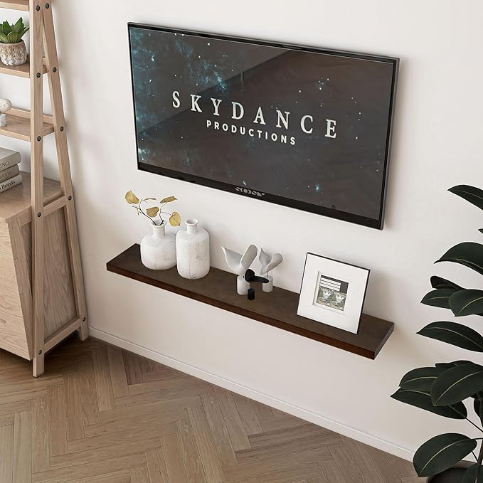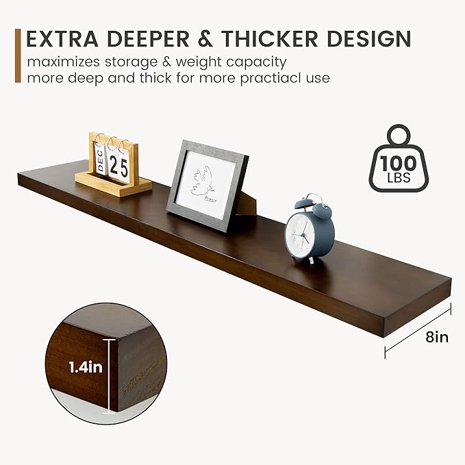- Extra Deeper & Thicker for Storage - Each board measures 48"W x 8"D x 1.4"H. Extra deeper and thicker design in order to bring maximizes storage space and weight capacity, even hold up to 60 lb. This floating shelf taking up zero square feet, reduces clutter and highlights dÃĐcor in compact spaces. It can help make full use of the empty wall, making it much more space-saving and making your room look larger and tidier.