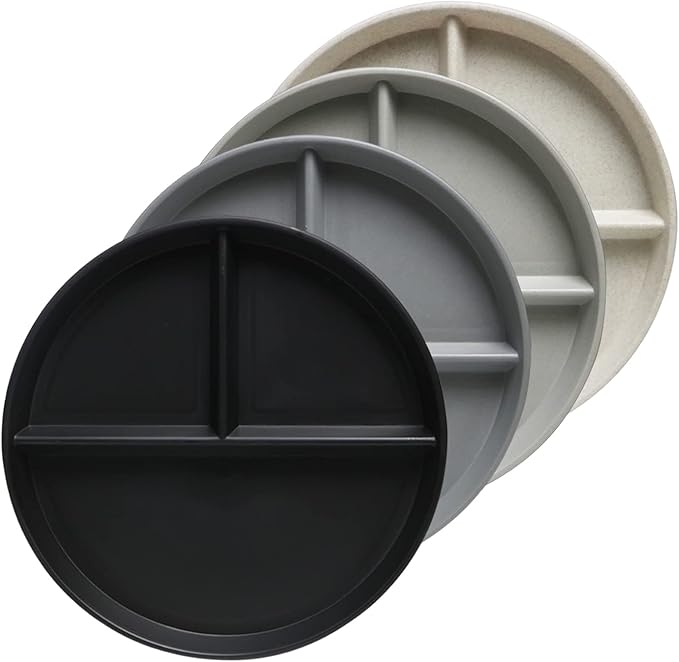- Greenandlife 9 INCH PREMIUM DIVIDED PLATES: Our reusable plate set including: 9 Inch Compartment Plates x 4 (Black, Dark Grey, Light Grey, Beige). The unique gray and black dishes make your dining table look more elegant. Stackable design and light weight make it easy to store and carry. They are not only suitable for home and kitchen use, but also convenient for RVs, camping, traveling, picnics, parties, dorms, schools and offices