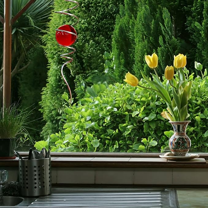- 【Unique Spiral Design】The gazing ball spiral is an unique hanging ornament ,Also it can help to stabilize 3D wind spinners or yard decor from swing when it rotate.When the spiral tail rotates to the left, the glass ball seems to move upwards,when the spiral tail rotates to the right, the glass ball seems to moves downward,the glass ball seems to like floating and dancing in air, presenting a magical optical illusion!