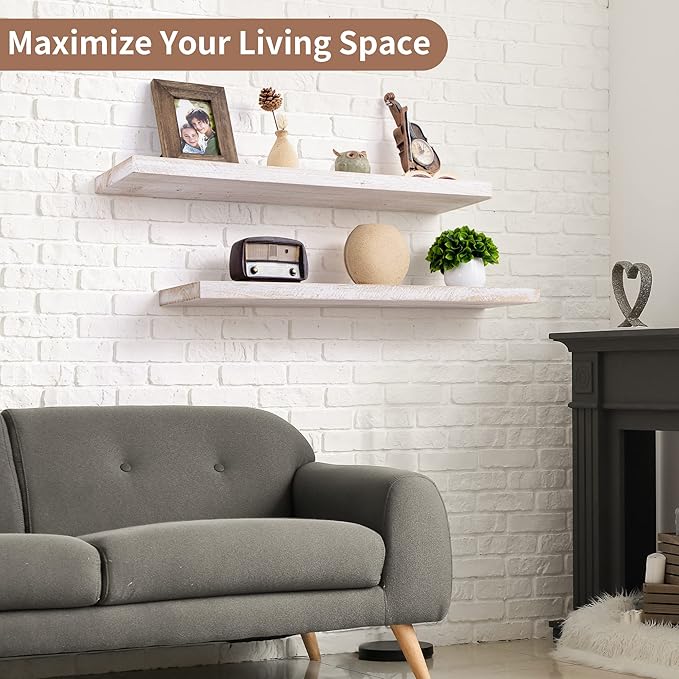 Axeman Floating Shelves for Wall, 8 Inch Deep Rustic Solid Elm Wood Wall Shelves for Storage, Wall Mounted Display Shelving with Invisible Heavy-Duty Metal Bracket, 36'' Width Set of 2, White Wash