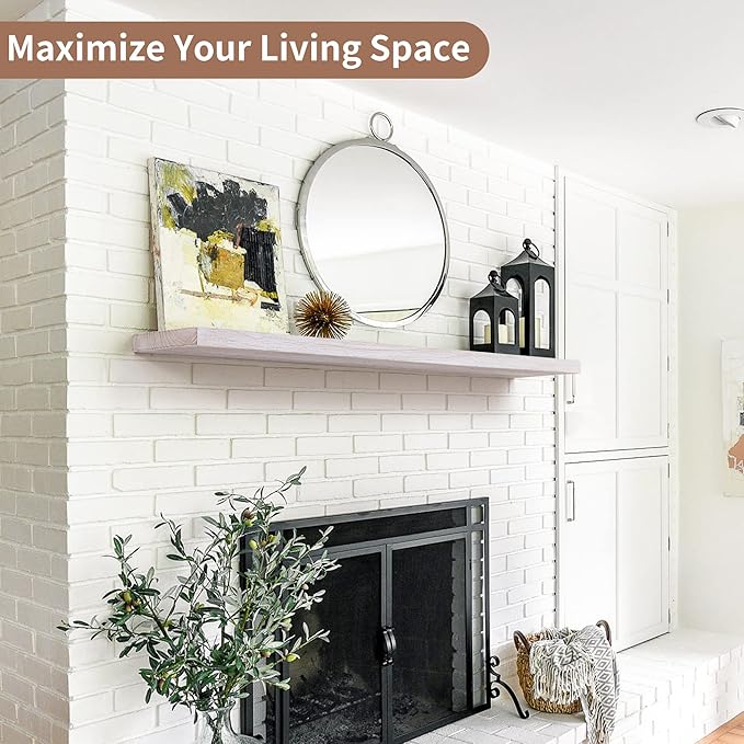 Axeman Floating Shelves for Wall, Rustic Elm Wood 48''W x 8" D Wall Shelf with Invisible Bracket, Large Long Wall Mounted Storage Shelves for Living Room, Bedroom, Kitchen, Bathroom Decor, White Wash