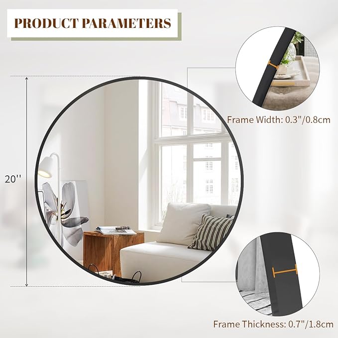 • Modern Brushed Frame Design: 20-inch black circle mirror is crafted of an aluminum alloy metal sleek frame, making it ideal for bathroom mirror, entrance mirror, vanity mirror, living room mirror