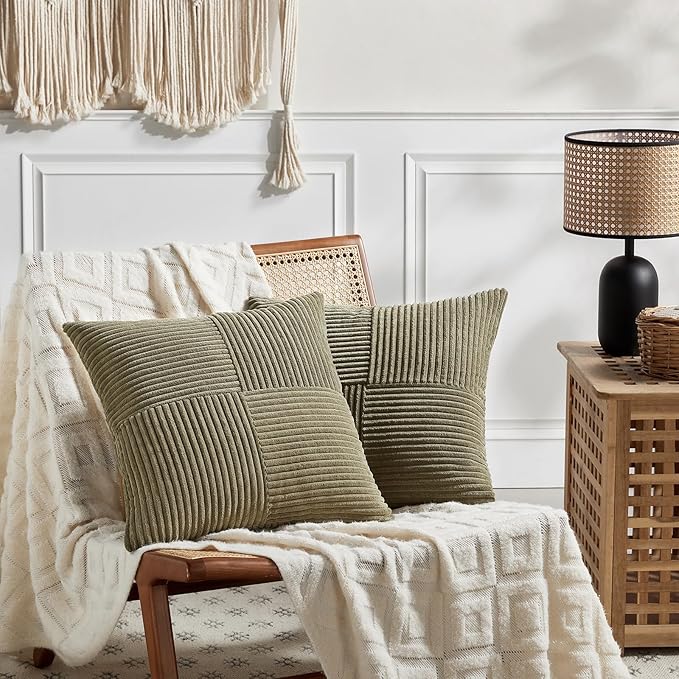 Fancy Homi 2 Packs Olive Green Big Decorative Throw Pillow Covers 24x24 Inch for Living Room Couch Bed, Rustic Farmhouse Boho Home Decor, Soft Corss Corduroy Patchwork Accent Cushion Case 60x60 cm