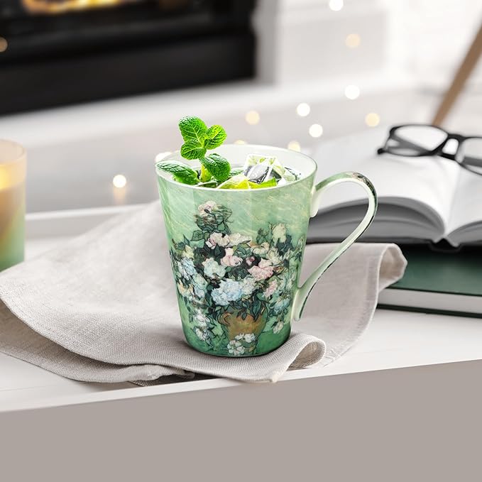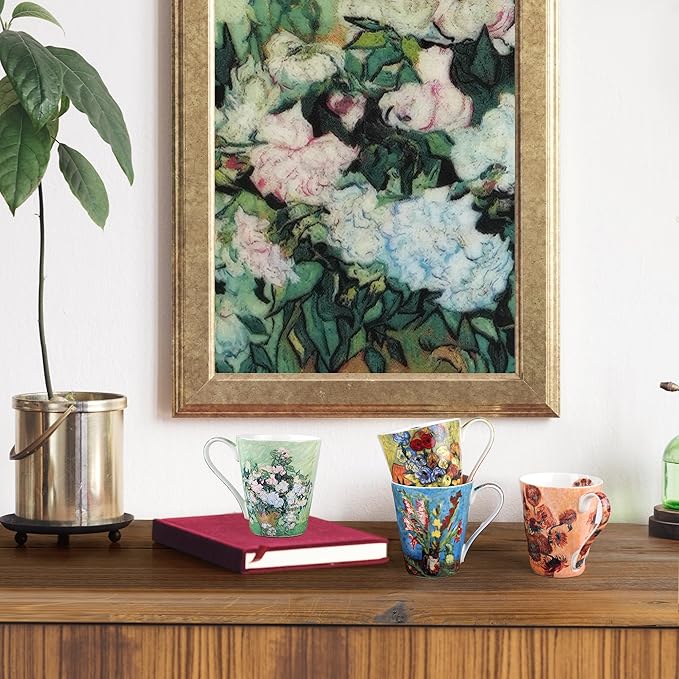 Coffee Mug Sets of 4, 12oz Bone China Porcelain Cups with Art Print Large Handle Dishwasher Microwave safe for Tea Cocoa or Hot Chocolate