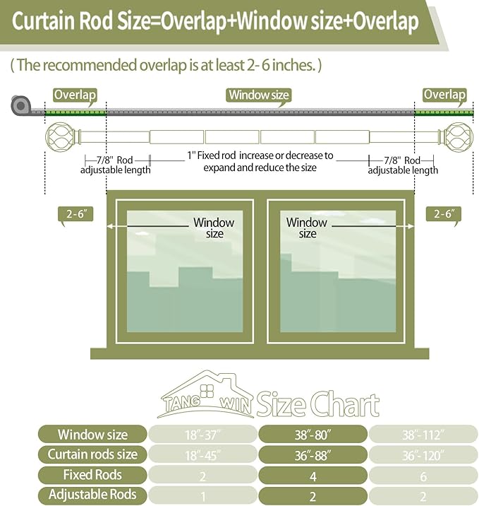 - Curtain Rods for Windows 48 to 84 inch(4-7ft): TANGWIN drapery rods include 4 x 16" x 1" fixed rods, 2 x 16" x 7/8" adjustable rods, 2 x finial,3 x bracket, 3 x connector, 6 x anchor, 6 x screw. Black curtain rods for windows can extend from 36 to 88 inches, choose the right size curtain rods according to the length of your window.