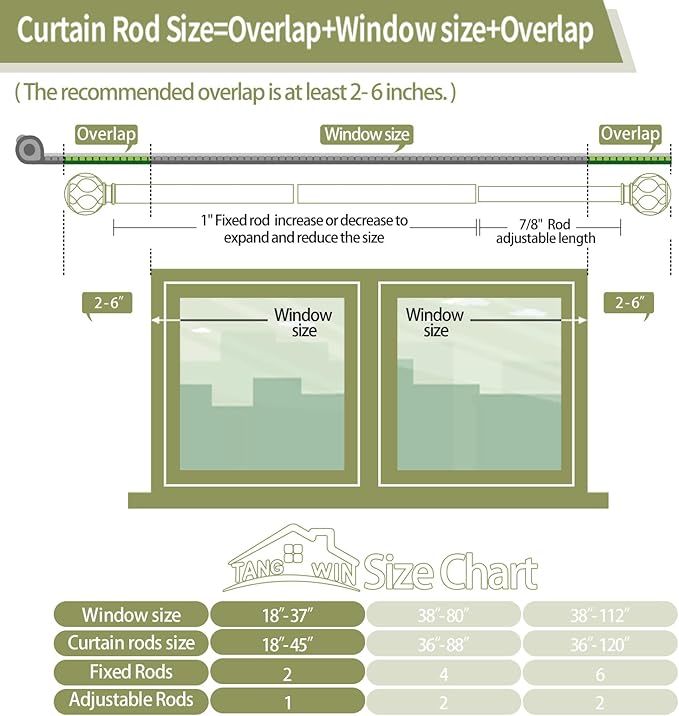 - Curtain Rods for Windows 28 to 48 inch(2.3-4ft): TANGWIN drapery rods include 2 x 16" x 1"fixed rods, 1 x 16" x 7/8"adjustable rods, 2 x finial, 2 x bracket, 1 x connector, 4 x anchor, 4 x screw. Black curtain rods for windows can extend from 18 to 45 inches, choose the right size curtain rods according to the length of your window.