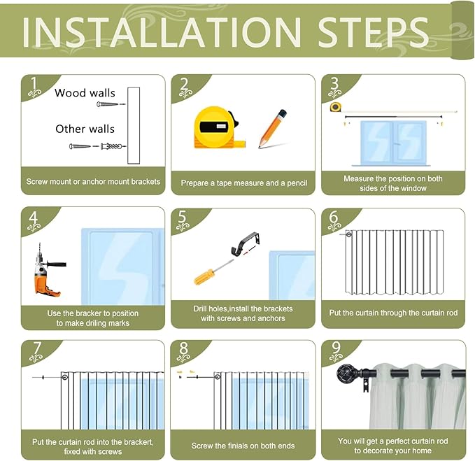 - Easy to Install Curtain Rods: TANGWIN provide detailed illustrated size instructions and modern decorative window curtains rod shipping package has detailed installation instructions inside, follow the steps, black curtain rods can easily complete the installation.