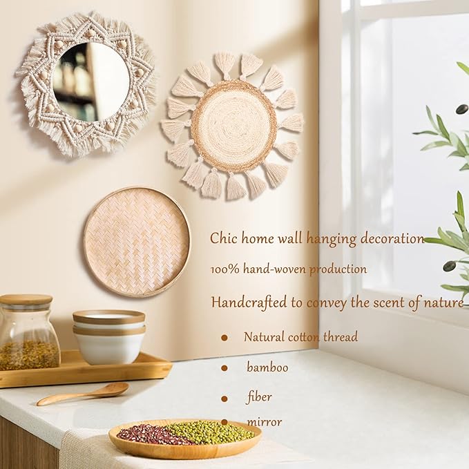 - 【Value Combo Set】:The product is a combination of boho macrame mirror and tassel placemat pendant with bamboo tray woven wall basket decoration, combined into an beautiful set of decorative aesthetic wall art.