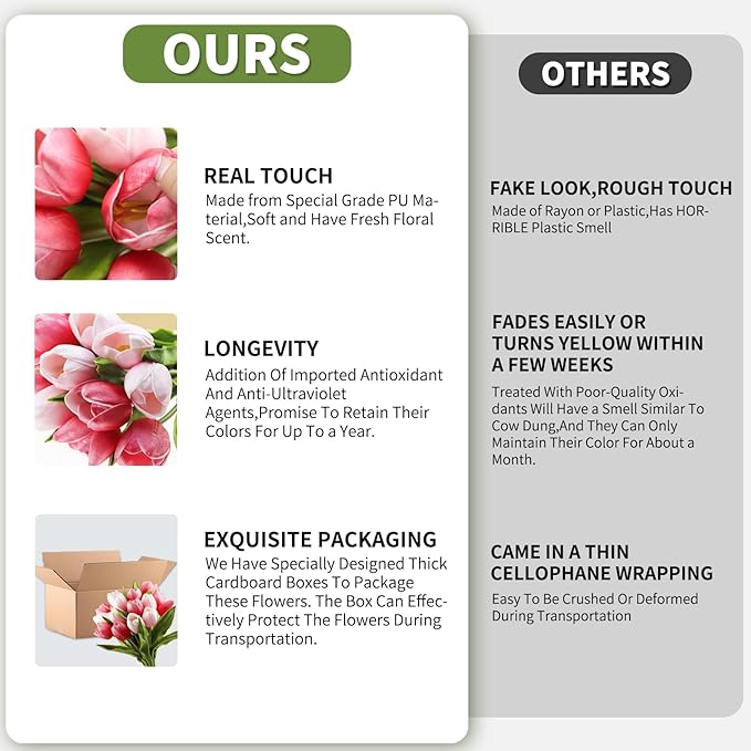 - High-Quality PU Material:Our artificial tulips are made of high-quality PU material,providing a soft touch just like real flowers,the realism is impressive. Completely eliminating the issue of plastic or chemical smells,making the flowers more environmentally friendly and harmless to the human body.