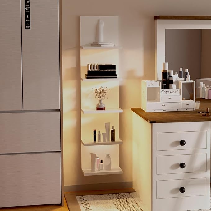 5 Tier Wall Shelf with Light, White Modern Vertical Lack Wall Shelves, Wall Mount, Floating Column Home Decor Shelves for Bedroom, Living Room, Vanity Storage Display