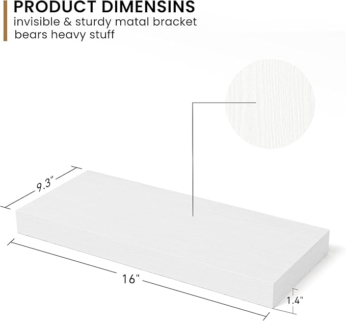- 9 Inch Deep Design - This wall shelf measures 16"W x 9"D x 1.6"H. Extra deeper and thicker design in order to bring maximizes storage space and weight capacity, even hold up to 40 lb. This floating shelf taking up zero square feet, reduces clutter and highlights dÃĐcor in compact spaces.