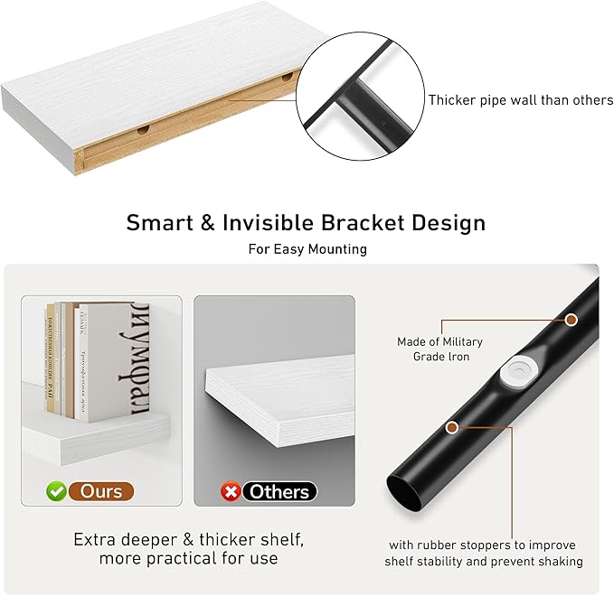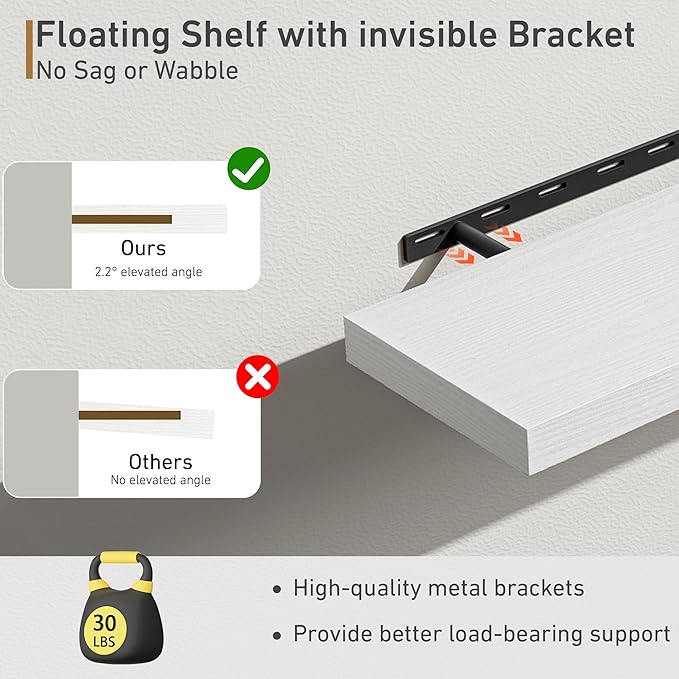- Easy To Assemble - This floating shelves come with stainless-steel galvanized invisible brackets, toggle bolts for drywall & a simple instruction manual to help you install. The assembly of this wall shelf is very simple, only one boards and some necessary screws and other hardware, and we also have detailed instructions for you to view, you can assemble quickly. Please contact us with any questions or problems at Amazon or Fun Memories.