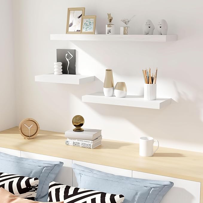 - Rustic & Modern Wooden Floating Shelves - Our shelf is made of durable engineered wood with a natural wood grain finish for a rustic feel. Matte surface makes it modern and minimalist look. It can be mounted and decorated on every wall of your home, perfect for various scenes, whether display your collection or storage.