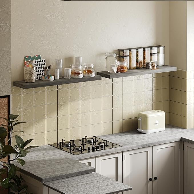 - 【FREE YOUR IMAGINATION】You can let your imagination run wild with this high and mighty floating shelves. Install it in a bedroom or bathroom to hold beauty/hair products; place it under a mirror in an entryway or in a long hallway to display family photos gallery style; display trophies and honors near a fireplace, use it in a kitchen to hold spices and jars, etc.
