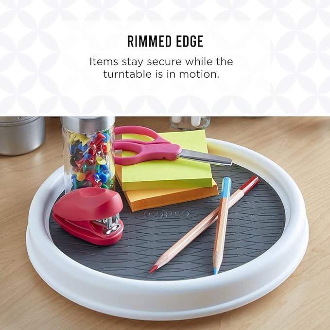 • RIMMED EDGE: The outer rim prevents items from falling off, non-skid surface keeps items in place while rotating. Durable, easy-to-clean polypropylene with non-skid beaded surfaces