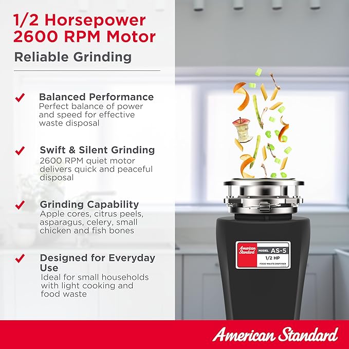 • VERSATILE GRINDING: American Standard garbage disposals handle a wide range of food waste, including soft & tough items, grinding them into fine particles that easily pass through your plumbing system and is safe for septic tanks. This makes it suitable for various kitchen needs