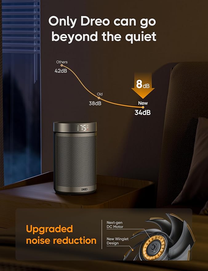 - Cozy quietness: No more choosing between quiet or warmth, Dreo's heater for bedroom warms quietly thanks to its brushless DC motor with frictionless performance and a winglet fan design that reduces turbulence, reducing noise to only 34dB.