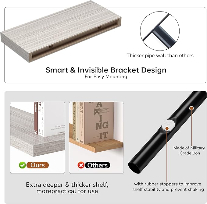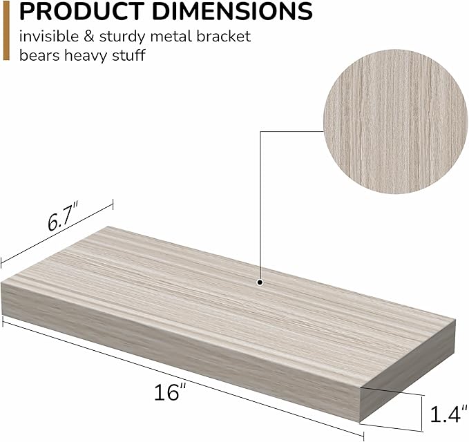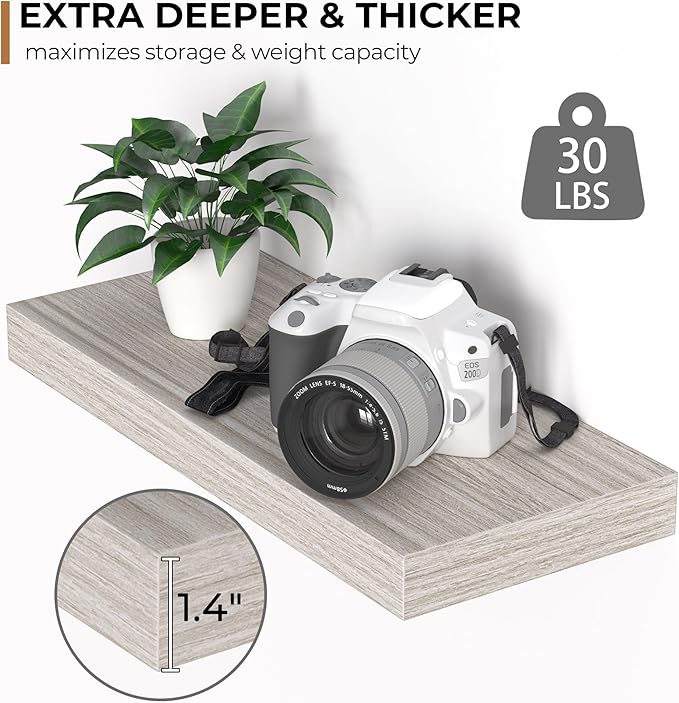 - Extra Deeper & Thicker - Each board measures 16"W x 6.7"D x 1.4"H. Extra deeper and thicker design in order to bring maximizes storage space and weight capacity, even hold up to 30 lb each. This floating shelf taking up zero square feet, reduces clutter and highlights dÃĐcor in compact spaces.