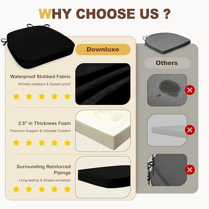downluxe Chair Cushions for Dining Chairs, Waterproof Kitchen Chair Pads, Non-Slip Dining Seat Cushion with Ties, 17" x 16" x 2.5", Black, 4 Pack