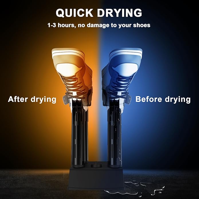 - Next-Level Shoe Drying: Take your shoe drying experience to the next level with this shoe dryer. The innovative ventilation tubes quickly absorb moisture inside the shoes and vent it out safely, allowing you to efficiently dry all kinds of damp footwear without worrying about water damage to the machine, extending its lifespan, keeping them fresh and ready to wear at all times