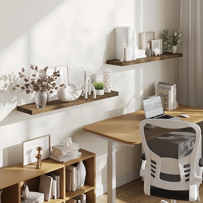 - 【GREAT FOR ANY ROOM】Our wood floating shelves are made of MDF with a frosted surface texture for a mordern feel that blends perfectly into a variety of different scenes. Having this large floating shelf not only for its decoration effect, but also for its high practicality. It can be used for organizing all household rooms, such as bedroom, living room, study, toilet, cloakroom, even kitchen and warehouse.