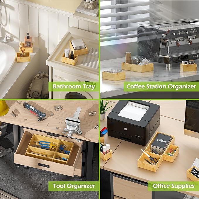 - Versatile Junk Drawer Organizer Bins - Great drawer organizers for any place. Used in kitchen to organize spoons, spatulas, whisks, wine stoppers, bottle openers, bag clips, baking utensils and other kitchen gadgets; used as bathroom vanity tray to keep perfume, candle, jewelry, trinket, watch, key neatly; or used as desk organizers to accommodate your desk supplies, like your pens, business cards, post-its, paper clips etc. It will make a great addition in your home or office
