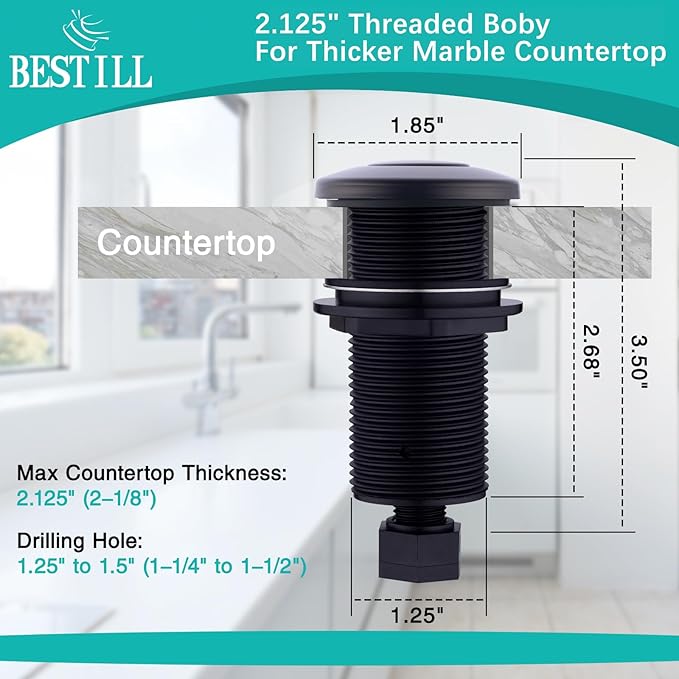 • EASY TO INSTALL - Garbage Disposal Switch Button can be easily mounted on any countertop or sinktop by drilling a 1-3/8-inch diameter hole. 3-inch thread plunger is not only for stainless steel sink top, but also for thick counter top like granite, marble, quartz, wooden and more.