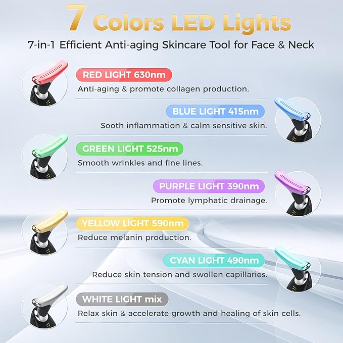 • [7-in-1 Multifunctional Massager] This face neck massager has 7 different LED light modes that are not only suitable for massaging the face, neck but also can be used to massage the arms, shoulders and other body parts, tightening the sagging skin and relaxing the muscles.